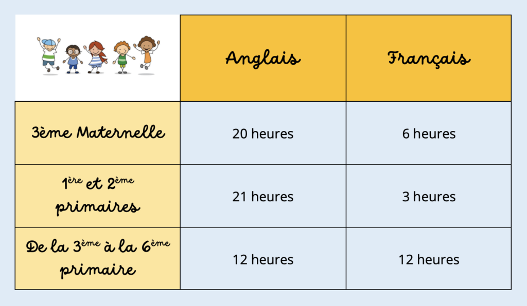 La pédagogie immersive consiste à plonger l’élève dans un bain de langue en dispensant les matières du programme dans la langue cible, l’anglais. Le nombre d’heures d’anglais est important les premières années: